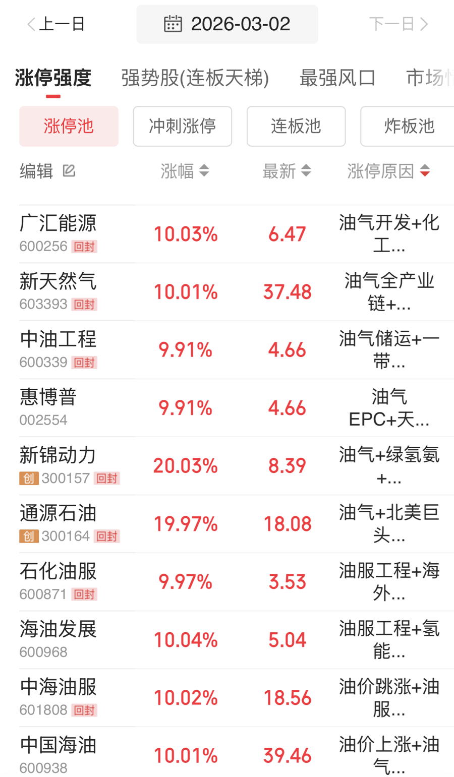 3月2日,A股油气板块多只股票涨停。