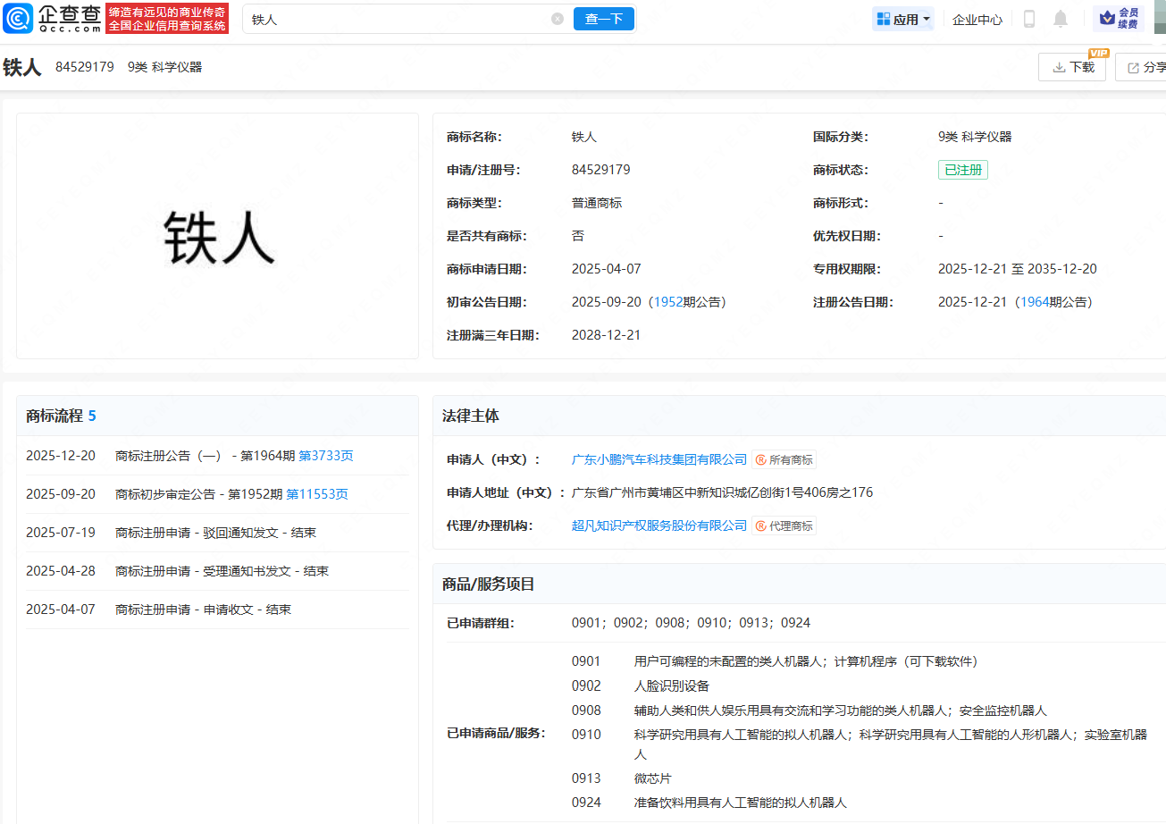 近日,广东小鹏汽车科技集团有限公司成功注册一枚“铁人”商标牛360配资,国际分类为9类科学仪器,已申请商品/服务包括:科学研究用具有人工智能的拟人机器人;科学研究用具有人工智能的人形机器人;实验室机器人等。此前,小鹏发布IRON人形机器人,引发热议。