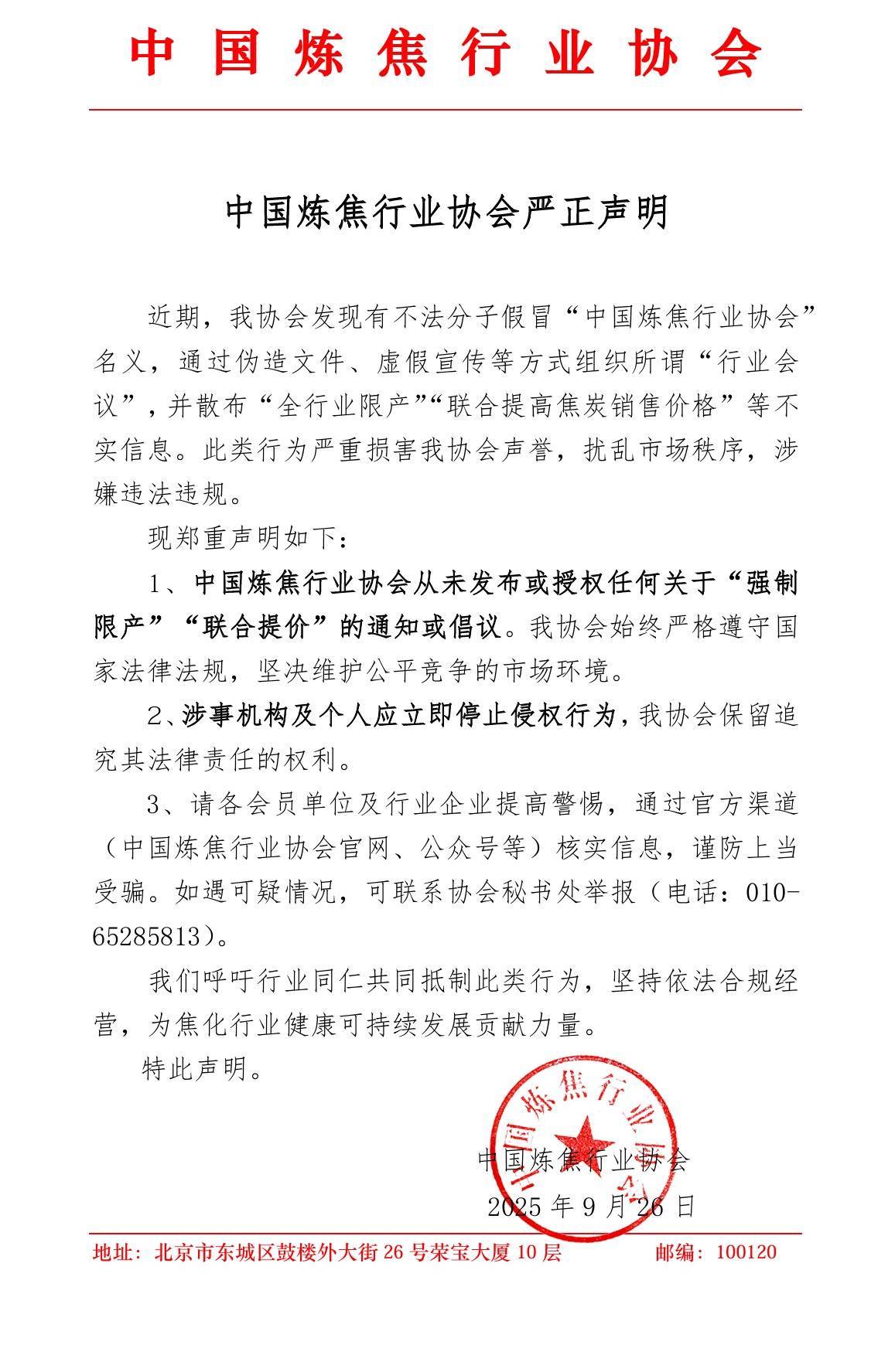 中国炼焦行业协会声明称:1、中国炼焦行业协会从未发布或授权任何关于“强制限产”“联合提价”的通知或倡议。我协会始终严格遵守国家法律法规,坚决维护公平竞争的市场环境。2、涉事机构及个人应立即停止侵权行为,我协会保留追究其法律责任的权利。